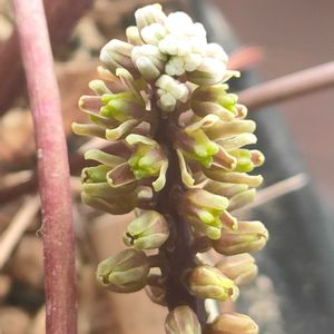 ドリミオプシス・プルプレアの花…のハズ。 下の方、数日開いたあとで閉じたのだけれど、いま開いてる中ほどの部分、これで咲いてるのかな…?!花の中の構造どうなってるの😵💫雄しべも雌しべもワカラン〜〜 ほとんど休眠してる中で2株だけ元気なので置き場も水も判断が難しい😂