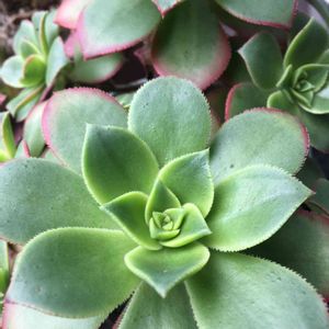 ちまちま寄せにあった子を 別の鉢に植え替えて半年… こんなに大きくなりました! 縁取りが赤くてギザギザ✨✨お気に入り でも名前が? 「アオエニウム 夕映え」でしょか〜