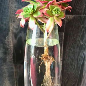 水栽培のアエオニウム 夕映。 1番の古株だった水栽培のグリーノビアが、沢山の花を咲かせて残念ながら枯れてしまいました。その器に根が伸びた夕映をお引越し、花束みたい✨ アエオニウムは、多肉の水栽培の中でも姿が乱れにくいから好き。