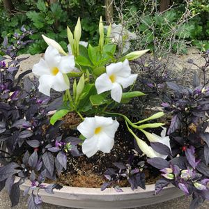 こんにちは😃 梅雨に入るので、寄せ植え解体して新しくしました😃鉢良くない⁉️ プラスチックの鉢に黒いペンキ塗りました😆バエます❣️