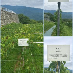 登美の丘は、'ぶどうづくり'にとって 理想的とも言える環境に立地🍇 土壌改良や糖度の研究👀 日本酒が主流だった、当時の日本人へのワインアピールなど😀 100年間の歴史があるようで!✨ pic右: 〝垣根仕立て〟栽培のカベルネやメルロー種のぶどう 左: 甲州の白ワイン用 〝棚仕立て〟 2019/8/19 ②