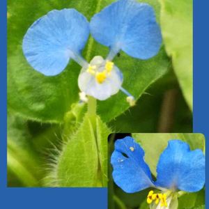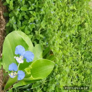 🌸マルバツユクサ🌸 小さい右下のは普通のツユクサです。 マルバツユクサは普通のより、少し小さく 毛の生えたガクから顔を出します。 葉は、丸くて波打ってます。 普通のとは違うんですよ! よーく見てね😃 両方、うちの畑に はびこってます。