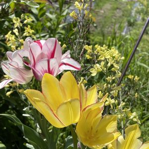 八重咲きチューリップ 🏷️日曜日はビタミンカラーの日 ムラサキハナナとチューリップ マムシソウ 小さめでも凛としています。