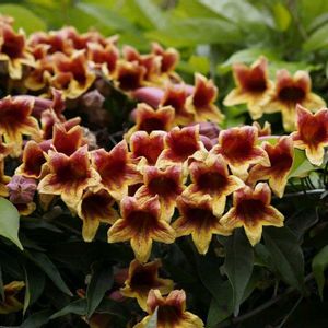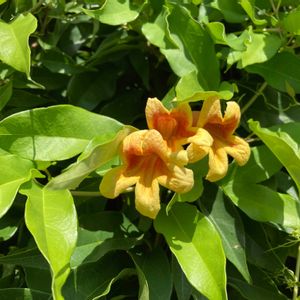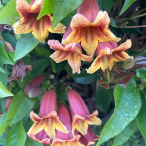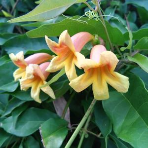 ツリガネカズラ ノウゼンカズラ科 渋滞した高速の降り口の壁面を飾っていて、思わず📱。誰?見たことないなあ😲 中南部原産のノウゼンカズラ科の蔓性低木で、 壁面緑化などの園芸用として栽培されたものでした。 5月中旬のpic