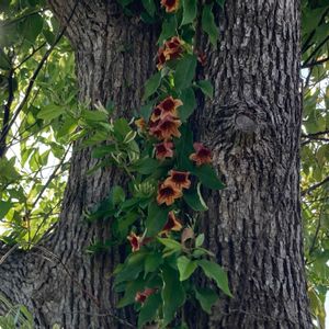 🍀ツリガネカズラ・ビグノニア🍀 今日は雨☔ 昨日撮っておいたツリガネカズラを投稿します。 ウチに来たのは20年以上も前なのに、 お花が咲き出したのは2年前から・・・ 今年は初めてこんなにも沢山のお花が咲きました💕💞🤗🎶🎵 ぷ〜んと、カレーの香りがしますよ。🤗🎶🎵 去年は支柱を立てて 全体に日が当たるようにしました〜 だって、側の牡丹⑤に絡みついて牡丹が弱ってしまい 枯れる寸前になっていました。😱😱😱😅💦 今年は牡丹は咲かなかったけど 少しは持ち直したかな〜と思います。 (ミョウガの根が悪さをしている可能性もあります。🤔😅💦)