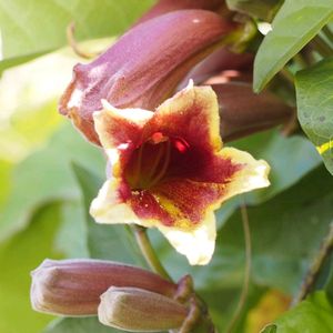 釣鐘葛 ノウゼンカズラ科 ツリガネカズラ属 アメリカ中南部原産 花に独特の匂いがあり、モカの匂いと言われるが、残念ながら私には感じられなかった 茎で巻き付くだけではなく、巻きひげにツタのような吸盤を持っているため、巻き付くことができないような壁面にも這い上がることができる。葉は常緑性で三出複葉とされるが、頂小葉は巻きひげに変化しているため、小葉は二枚しかないように見える。 (35.8992384, 139.9234505)