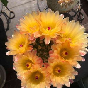 獅子王丸が一斉にパッカーン🎉👏 パステルイエローにピンクがなんとも可愛いー😍 しかし、サボテンは名前とお花の雰囲気のギャップが面白い🤣 多肉の名前は可愛いのになぁwww