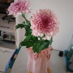 ピンクの花にピンクの花瓶は どうなんでしょう🦧 商店街で菊1輪買ったのに、 帰ったら2本でした🙏🌞