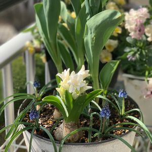 八重咲きヒヤシンスとムスカリとチューリップの寄せ植え😊 もうちょっとヒヤシンスの背が伸びると予想してましたが、この子はおチビちゃんなのかな😅 ヒヤシンスとムスカリが咲いてきて可愛いです🥰 チューリップ🌷はいつ咲いてくれるかなぁ?😊