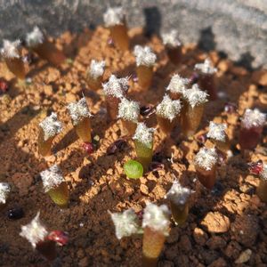先日植え替えた多肉各種。 ①2つは2019年秋蒔きの細弁咲碧瑠璃鸞鳳玉、右だけ20年か21年蒔きの鸞鳳玉。恩塚は全滅しました。 ②〜④はたぶん2022年蒔き。 ② 3つが岩牡丹。2つがブラボアナス。アリオカルプス属、成長が遅いです。 ③五稜兜2種とラピダリア。 五稜兜も成長遅かったですが、模様も綺麗に出てきて良かったです。 ④フレッズ レットヘッド。 11個同じプランターで育っていましたが、大きくなったので2つのプランターに分けました。