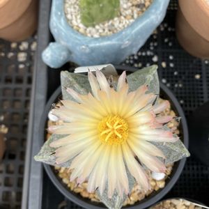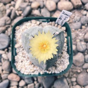 ランポー玉♡ 淡い黄色いお花が 優しげなんです〜💛✨️ この夏に3度目の開花🌼*・ 次の蕾ちゃんも控えてますよ〜♪ どっしり感あって 刺なし💕 白い斑点もオシャレ〜♪ 春に植え替えたばかりなのに 重量感あるので もうプラ鉢が割れちゃった😂