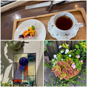 本日のお稽古‼️ 生徒さんの作品、完成しました☺️ ミニパネル、タイトルは小宇宙。 カフェを始められるので、どこかの窓に入るそう🪟 お茶🫖タイムには、タルトを食べて頂きました🤭👍 家の入り口に置いている寄せ植え🌼 この頃良くバッタがとまっていて、花も葉っぱも穴空きになってます😓 殺虫剤を振るべきか‼️迷う