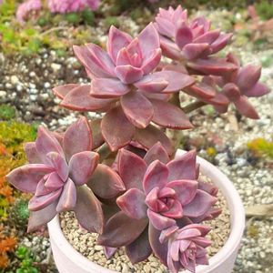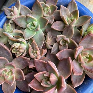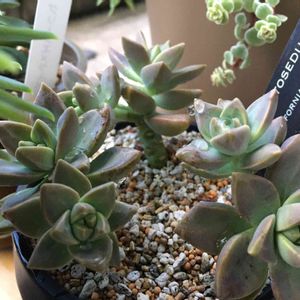 同じ種類を群生させている 頭上の棚を🤳したら 違う種類が混じっている鉢を発見🙀❕ カルフォルニアサンセットさんの葉挿しちゃん鉢に 銘月さんが いらっしゃいました🐱 多分葉っぱちゃんが似ているので 混ざっちゃったのでしょお…😺 でも此れも可愛いな…😺💕