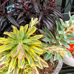 ユーフォルビア ゴールデンレインボー** なぜか下の方だけ花が咲いてる😁 後ろは ストロビランティスブルネッティー 右は ユーフォルビア シルバースワン