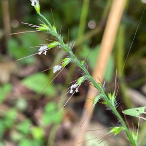 ケチヂミザサ(毛縮み笹) イネ科チヂミザサ属 道端に沢山咲いていました。ひっつき虫の一つです。 葉にシワがあるイネ科の草。花が地味ですが、小さな(3ミリ位)綺麗な花です。 茎に毛が多いのでチヂミザサと区別されます。 北広島町、龍頭山にて