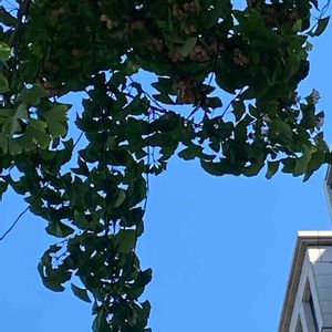 イチョウ(銀杏) ☘🌲🍎 地面に落ちて、踏まれて潰れた銀杏、見上げればまだ少し枝に付いていました☺️ 東京都のシンボルマークはイチョウの葉ではなく、”T“を図案化したモノです♪ でも、東京都の木はイチョウだそうです🎶