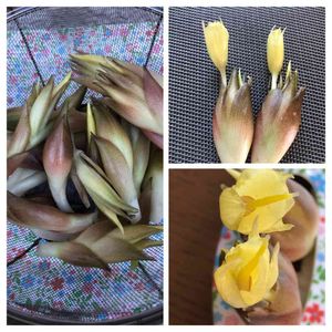 今年、初めての茗荷が発見しました。 1つだけですが😅冷や奴に乗せて食べます。 16日今朝、茗荷が9つ収穫出来ました。 全部で15個です。 20日暑かったので夕方覗いてみたら11個黄色い花が、早く収穫すれば良かった。