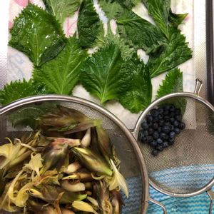 今日の収穫:庭 大葉、茗荷、ブルーベリー