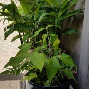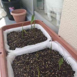 手前が寄せ植えで中央には種から育てたロウバイさんで奥が茗荷です😃。 青々して元気そうです😄