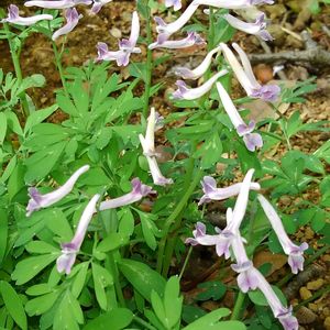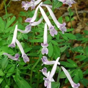 次郎坊延胡索(ジロボウエンゴサク) ケシ科キケマン属の多年草。明るい林や草地などに生える。葉は2~3回3出複葉。茎葉はふつう2個つく。花期は3~5月。地下にある塊茎から数本の茎を立て、その先に数輪の花を咲かせる。花は筒状で先端は唇状に開き、後部は距となる。花色は紅紫から青紫まで変異があり、まれに白花も見られる。果実は蒴果。長さ2㎝ほどで成熟すると鞘が2裂して巻上がり、その勢いで種子を飛ばす。 ムラサキケマンの近縁種でよく似るが、花が少ないのと葉が丸い点が違う。ヤマエンゴサクにも似ているが、花色と苞に違いがある。 江戸時代の伊勢地方で、子供がスミレを太郎坊、この花を次郎坊と呼び、花の距を引っかけて引っ張り合った草相撲のような遊びが名前の由来。ジロボウエンゴサクの仲間は根を乾燥させて漢方薬として使っていた。その漢方薬の名前を延胡索という。鎮痛、麻痺の改善などに用いられる。 出典『野に咲く花』『草木の種子と果実』『野草の名前 春』