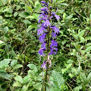 サワギキョウ 湿地で出会う 美しく青きドヨウ🏷花弁は上唇2深裂、下唇は3浅裂で、ミゾカクシと同じような形だけれど、上の唇弁が大きく横に広がってます💜 筒状に合着した集約雄しべには、細く束になった長毛の付属物がありますねぇ(◕◕)これはセンサーの働きをしていて、吸蜜に来たムシが触れると毛の根元の蓋が開いて虫が離れると元に戻って花粉の放出が止まる仕掛けみたい(ง ᐕ)ง (2枚目) 花粉が出終わった頃、葯を裂いて花糸が伸び花柱が出現する雄性先熟♫ (3枚目) 葉は披針形で互生し、縁に細かい鋸歯があってガクは5深裂茎は分枝せず直立しておりました🟪(4、5枚目)