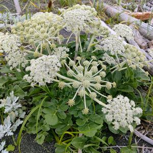 ハマボウフウ 🌱セリ科 ハマボウフウ属 ✽地上部が5〜30cmになる多年草 ✽全体に白い軟毛が密生する ✽葉は質が厚く1〜2回の3出複葉で小葉はさらに3裂し、裂片の先は円い ✽下部の葉には長い柄がある ✽花は軸の太い複散形花序に密につき、卵形のがく歯がある ✽花は雄性期から雌性期に変わる ✽果実は楕円形で隆起した稜があり長さ約5mm ✽根茎や若芽が食材として採取されて数が激減して ②は雄性期の花序 訪問者あり! ③➚の上方は雌性期の花序かな? 詳しくは分かりませんが、花を同時に咲かせるのでは無く、ずらして咲かせるようです! まだ咲いてる花もあり、花後も色々な表情が見られて楽しかったです♪