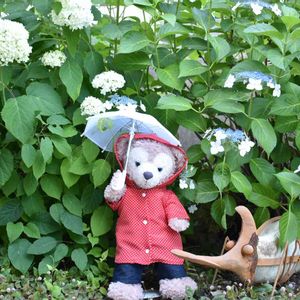 ぬいぐるみ用にレインコート作りました🧵 傘も買ったので、紫陽花の前でパシャリ📸 6月っぽくなりました😆