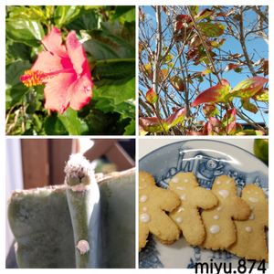 ↖このちっちゃいハイビスカス2日目デス 3日目も咲いてると思う人〜?🌺 ↗植えて13年目のヤマボウシ 紅葉した綺麗な葉っぱをこんなにたくさん見ることができたのは初めてかも😄👍️ ↙200円で購入してきた15cmのサボテン 頭がニョッキリ出てきました✌ じんじゃーくんに見えなくもない風貌です🤭 ↘娘が作ったジンジャークッキー 失敗したーと言ってますけど 一口食べたらホッペが落ちちゃう〜 見た目はアレレ お味は最高👍️ 今朝はまだ このクッキーしか食べてない😋