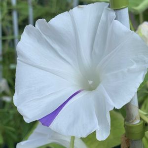 朝顔咲きました。 曜白朝顔にしては、 白い線が細くて格好良いです。 なんだかシャープで素敵な朝顔です。
