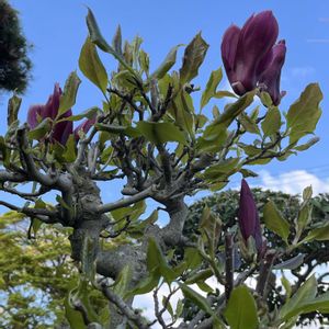 紫木蓮(シモクレン) モクレン科モクレン属の落葉低木。中国原産。古代に中国から薬用植物として日本に入り、後に観賞用となった。庭木や公園樹にされる。幹の根元から蘖(ひこばえ💬切り株から出た新芽)が出ることが多く、株立ち(かぶだち💬根際から多数の茎を分けて成長する状態↔️一本立ち)になることもある。花期は3~4月。葉の展開より先に枝先に暗紫紅色の6弁花を上向きに半開する。花弁の長さ約10㎝で、花弁の上部の幅が下部より広く先端はやや丸みがあり、内側は淡紫色。外側の小さな萼は3枚。葉は互生し、短柄で広倒卵形、先端は突き出す。果実は秋に成熟すると袋が裂けて赤い種が糸を引いてぶら下がる。 花色の薄い変種の唐木蓮(トウモクレン)、乳白色の花を咲かせる白木蓮(ハクモクレン)、本種とハクモクレンの交雑種である更紗木蓮(サラサモクレン)など多くの雑種や園芸品種があるが、一般にモクレンといえば本種のことで、花が暗紫紅色なので紫木蓮(シモクレン)とも呼ばれる。モクレン属は属名のマグノリアで総称されることもある。モクレン属Magnoliaマニョーリアは、フランス学者マニョール(1638〜1715)から来ている。マニョールは、モンペリエ(フランス南部の都市)の王立植物園の園長を務め、植物分類において科(familia)という言葉を最初に使った。後に、フランス人植物学者のプルミエ(1646〜1704)が、マニョールの業績を讃えて、マルチニーク島で見いだした樹木の属名を、マニョーリアと命名した。日本では、この語の英語化した発音のマグノリアの方が一般的に広まっている。 名前は中国での古名『木蘭』に由来する。平安時代は『モクラン』『モクラニ』と呼ばれた。江戸時代には、ハスに似た花をつける木から『木蓮』と書いて『モクレンゲ』とも呼ぶようになった。欧米へは日本から18世紀の終わりにもたらされ、アメリカ合衆国のルイジアナ州、ミシシッピ州では州花となっている。 出典『都会の木の花図鑑』『樹木 見分けのポイント図鑑』『生薬単』『樹木の名前』