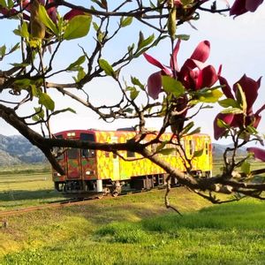夕陽を浴びながら紅花号が走ってきました 🚃 お花と電車