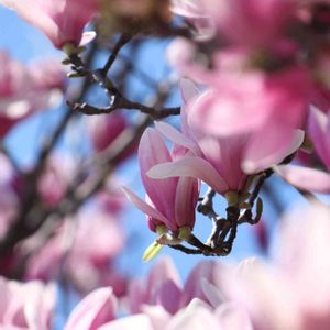 25年前に記念樹で植えた木蓮 春の陽射しに花弁の色が混ざり合ってピンク色に可愛く咲いています
