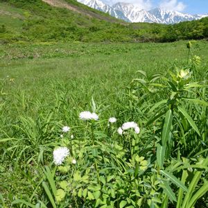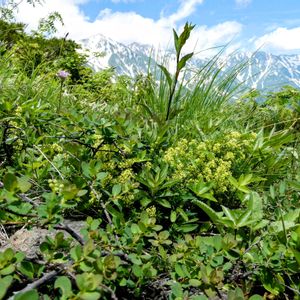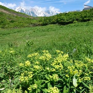 残雪の残る山々🏔️🏔️が背景の湿原に咲いていたハクサンタイゲキ💚💛💚爽やかな緑がかった黄色いお花でした😊✨ ハクサンという名前は白山に由来するそうで…別名がミヤマノウルシ、オゼヌマタイゲキ、オゼタイゲキだそうです❣️ 🏷日曜ビタミンカラー♪に参加させて頂きます🥰