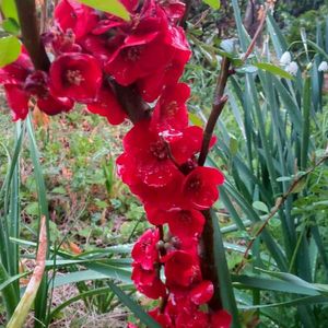 🌧️の夕方… しっとり濡れた庭に~ 真っ赤かな木瓜の花が 一際 鮮やか 🥰