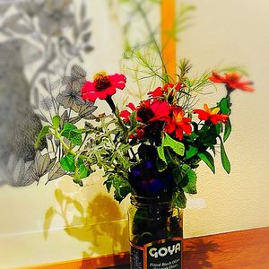ポトスの寄せ植えから何本か枝を切り纏めて花器に入れたらこんなにワサワサと💕 今年ののジニアは綺麗なジニア😍