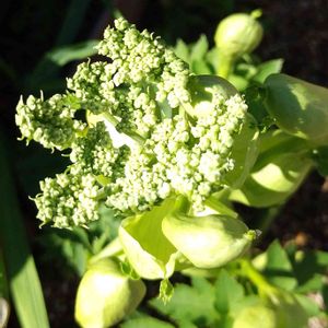 明日葉の花です。 草丈と言うか、樹高と言うか、3メーターは、有ります。 野菜として食べる物ですが、ほうれん草程の芽が出たばかりの頃は、かわいいのです。
