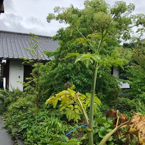 明日葉の花が咲き始めた。 茎の太さは、直径8センチ強。 高さは、3メートルです。 もはや木ではないか?