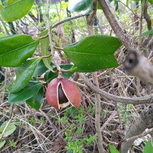 「ツバキの実」 二つ付いた実が一つだけ割れて中から黒い種が現れました😵 この状態を見たのは初めてです!ビックリ
