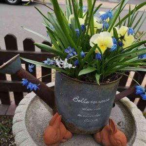 シラーシベリカとプシキニアを沢山詰め込んだジョーロ あららお向かいさんの車が帰ってきて写り込んでしまったわ💦 ま、ご愛嬌ってことで(笑)