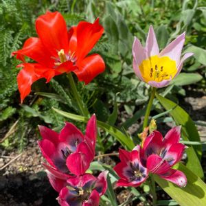 ミニチューリップ 黄色系統終わって 赤系統が開花してます 左上赤 リフォーリア 右上桃 サクサティリス 下ピンク リトルビューティー