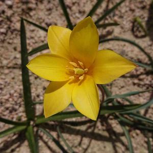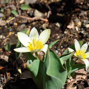 原種系 「ミニ・チューリップ」 ミニチューリップが開花しました。 今日は風も無くて🌻最高の天気です。 春が来ましたね。🎶 このチューリップをアップして良く見てください。 1本の花茎から、幾つも花が咲いているのです。 上の3個の花が1本の花茎ですけど、他にふたつの蕾が付いてます。 なので、全部で5つの花がこの花茎で咲くんですよ。 凄いですね。 原種系なのでしょうか? 可愛い花のチューリップです。