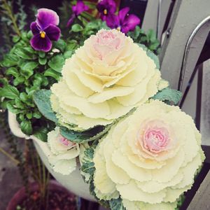 お正月の寄せ植の葉牡丹。 ビオラと一緒に植え直しました。だけど葉牡丹ばかりこんもりと盛り上がり、白くて真ん中がほんのりピンクで、ケーキ🎂みたいで美味しそう~😋 ビオラが少し可哀想かな。