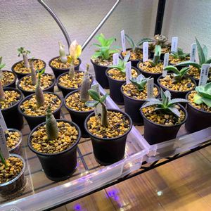 夏型塊根のお目覚め記事がだいぶ上がってきてますね。我が家も無加温で19度ありました。もう少しで一年を迎えるアラビカムたちを植え替えしました。根は、断水によりカラカラ。針金のような根と主根をカット。まずは根を目覚めさせたいので、ハイポネックスハイグレード活性剤200倍希釈で腰水管理。まだまだ寒いので腐りは心配していないものの、送風機は12時間回しています。お目覚めが楽しみです。 アガベたちも植え替え。YouTuberのローカさん用土にマグ。管理は同様。しっかり育ってくれると思います✨