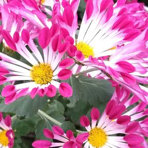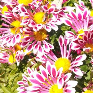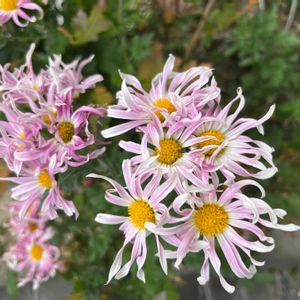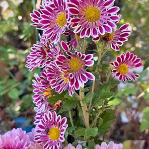 【風車菊(スプーン咲きスプレーマム)】 アメリカ原産、キク科多年草 茎頂の頭状花序に、花びらに見える筒状で先がスプーン状の舌状花と黄色いドーム状の筒状花を咲かせる。 スプレーマムの園芸品種。花径は4~8cm。 スプーン状の舌状花が風車のように見えることから「風車菊」の名がついた。 草丈:20~50cm 花色:ピンク、白、赤紫、赤、オレンジ、黄、褐色 花期:10~11月 吉本花城園@防府市にて