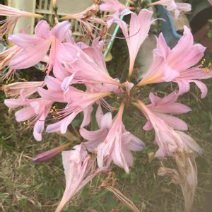 ちょっと枯れかけていますが3日くらい前から綺麗なピンクの花をつけていて アガパンサスにピンクあったかな?ヒゲがあれば彼岸花っぽいのですが。