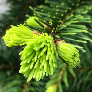 まるでバラ🌹 もみの木の雄花のかわいいこと 葉先にいっぱいついてます❣️毎年はさかないとか