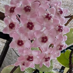 ホヤ・カルノーサ(サクララン) 5月から咲き始め1つ2つの時もありましたが、今また溢れる様に咲いています✨🩷🩷🩷✨ 数えたら15個も🤗🎶 エキゾチックな香りを漂わせています💟 調べたら、一度咲いた花座は再び蕾が付くとあったので、毎年花の数が増えると言うこと🤔? 来年も期待しちゃうな〜🥰🎶