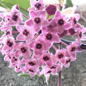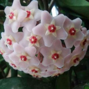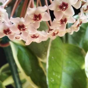 ホヤがあっという間に咲いてしまいました〜‼️‼️ 満開です✨✨✨ 前回のお花よりまあるくキレイに咲いてくれました💕💕 うれしいです😊 透明感のある蜜ろうのようなお花に癒されます✨✨✨ 花嫁さんのブーケのように下を向いて咲いています💕💕