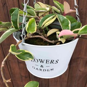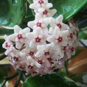 100均の観葉植物コーナーで3年前くらいに購入。今年初めて花が咲いたのですが種類がわかりません。蔓性の植物で葉は写真の上部に写っているものです。判る方がおられましたら宜しくお願い致します。