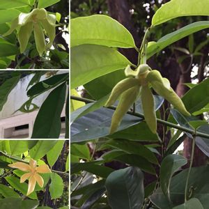 ずっと気になってる子🤔 オウソウカ。鷹爪花。別名ツルイランイラン。バンレイシ科の植物と教えて頂きました。ありがとうございます😊 とっても肉厚な花弁で、だんだんと黄色くなって散ります。脇から出た細い枝(ツルというよりも枝っぽい)の先端は引っ掛かる為になのかフックの様な形をしてます。 棚を作って日よけの屋根にしていたりもします。